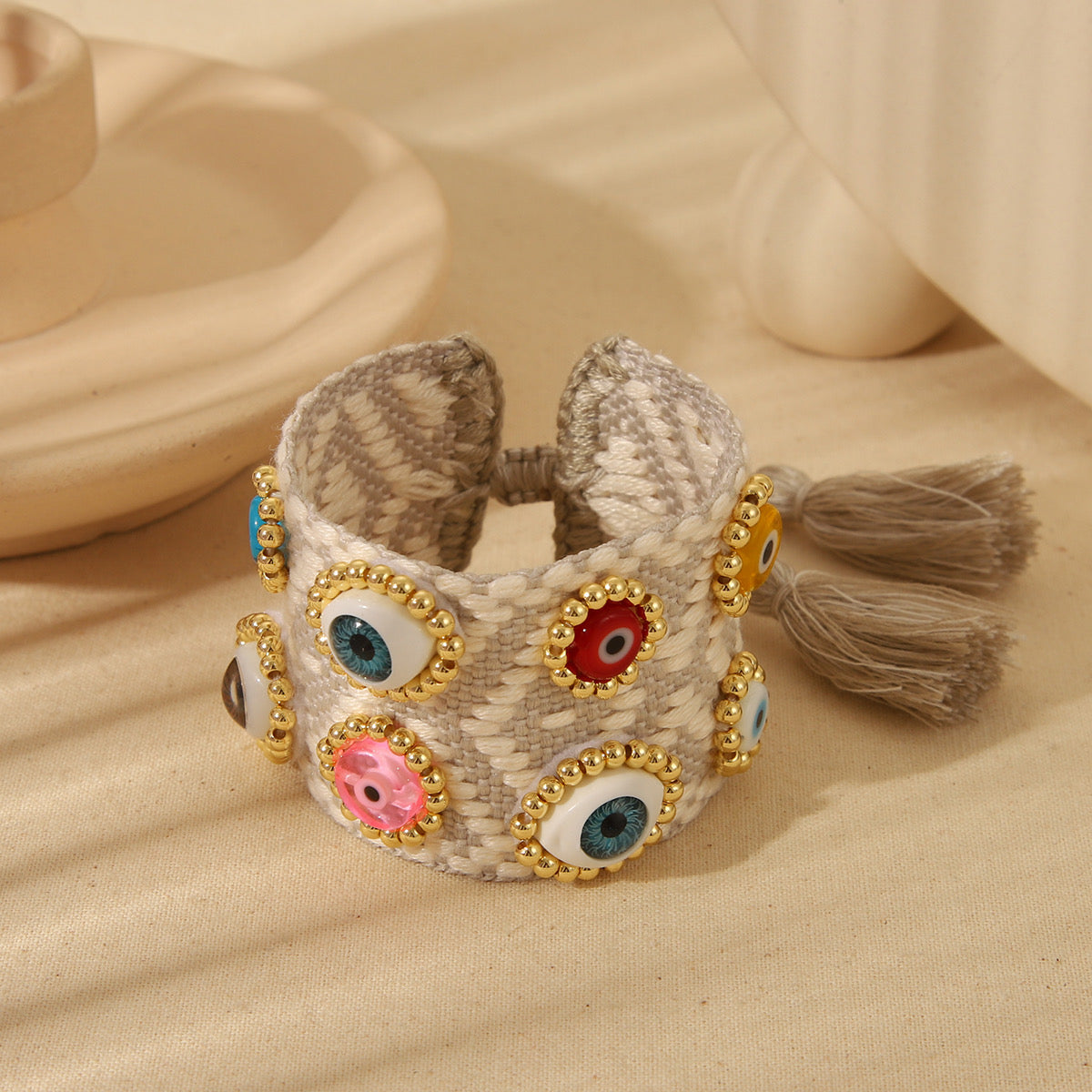 Add a bold yet protective touch to your style with our Devil’s Eye Unisex Woven Wristband. This handcrafted bracelet is designed like a wide woven wristband, featuring intricate black-and-white tribal patterns and adorned with colorful devil’s eye charms framed in gold-toned beading.