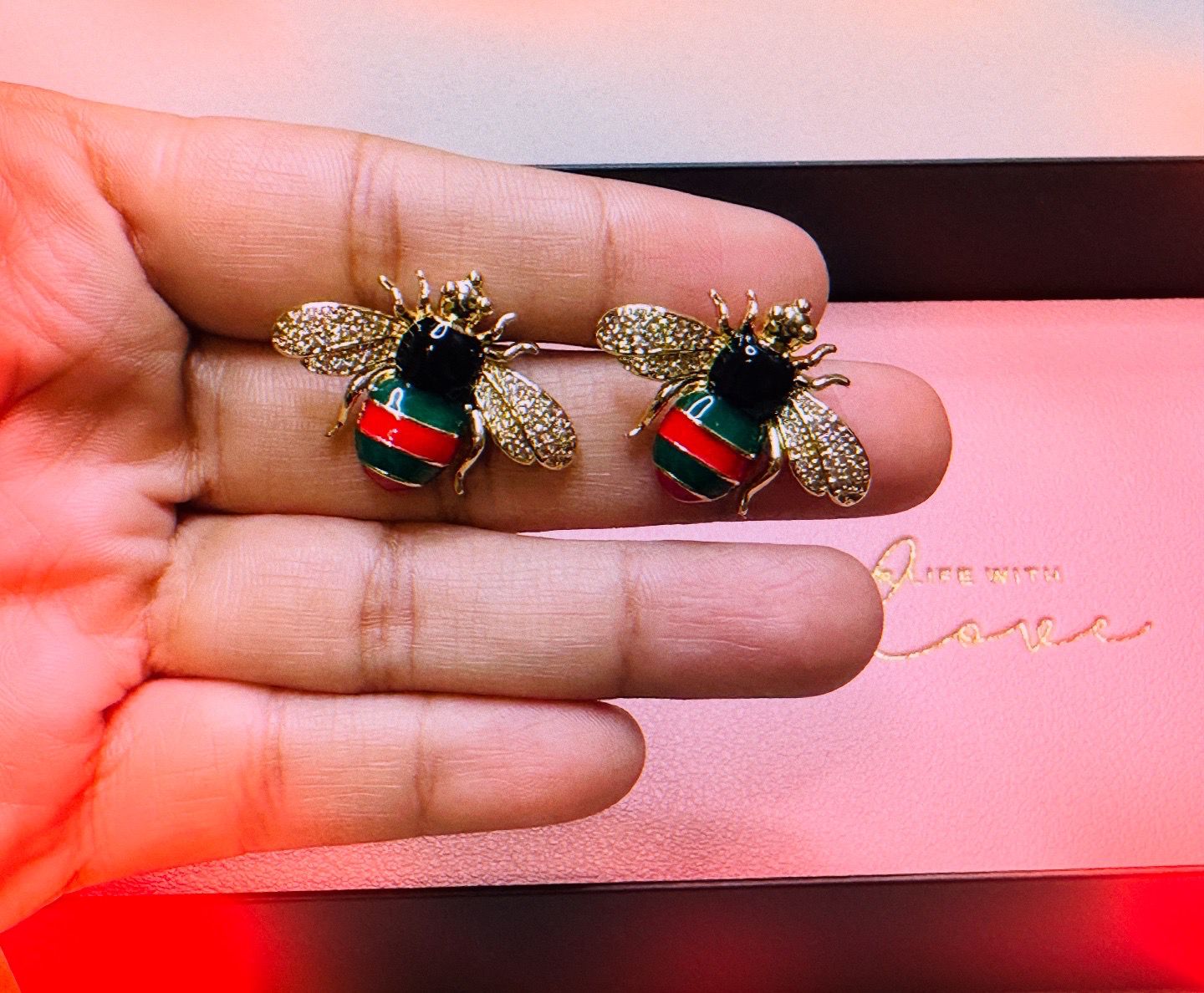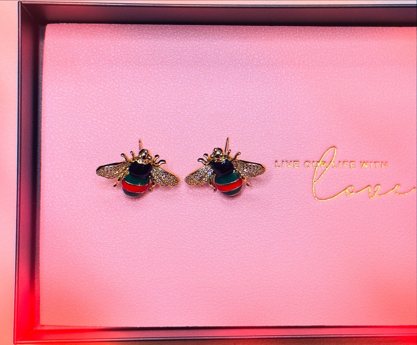 Turn heads with the Emerald Hive earrings — a luxe take on the beloved bee motif. These detailed bee brooch-style earrings feature glittering golden wings, a black enamel head, and a bold green and red enamel-striped body. Meticulously crafted from copper and finished with 18K gold plating, they radiate opulence and flair.