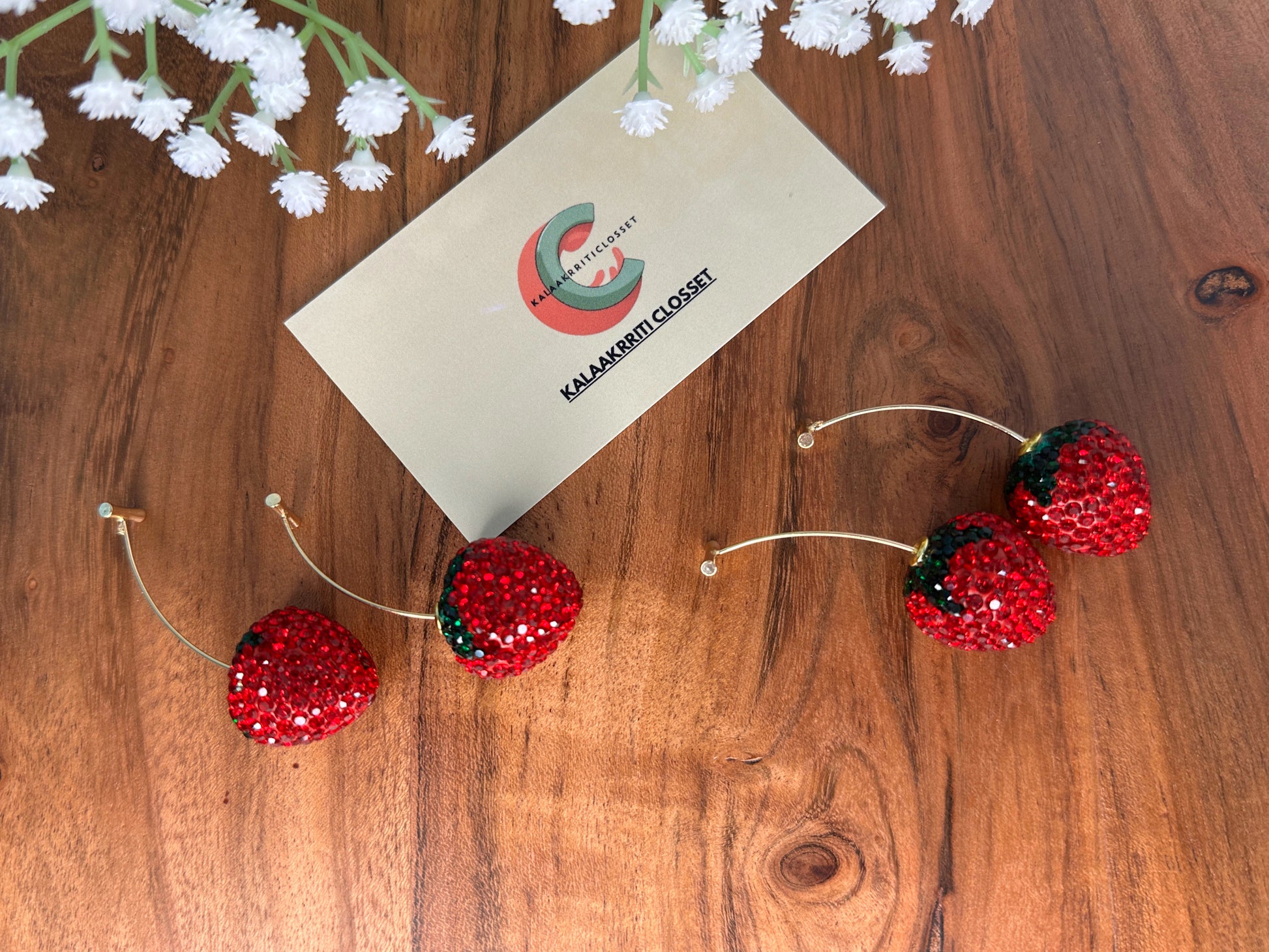 Add a touch of playful glam to your look with the Strawberry Sparkle Dangle Earrings. Designed in the shape of juicy strawberries, these earrings are encrusted with shimmering red and green rhinestones that catch the light from every angle. Suspended from a sleek, curved gold metal bar, the berries dangle freely to create an eye-catching, whimsical accessory. Perfect for quirky fashion lovers, party wear, or anyone looking to add a fun twist to their outfit.